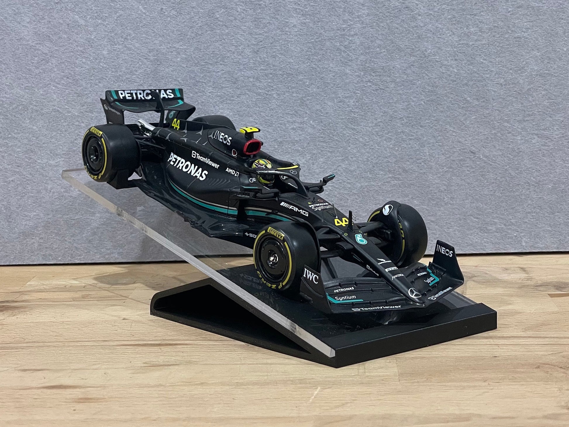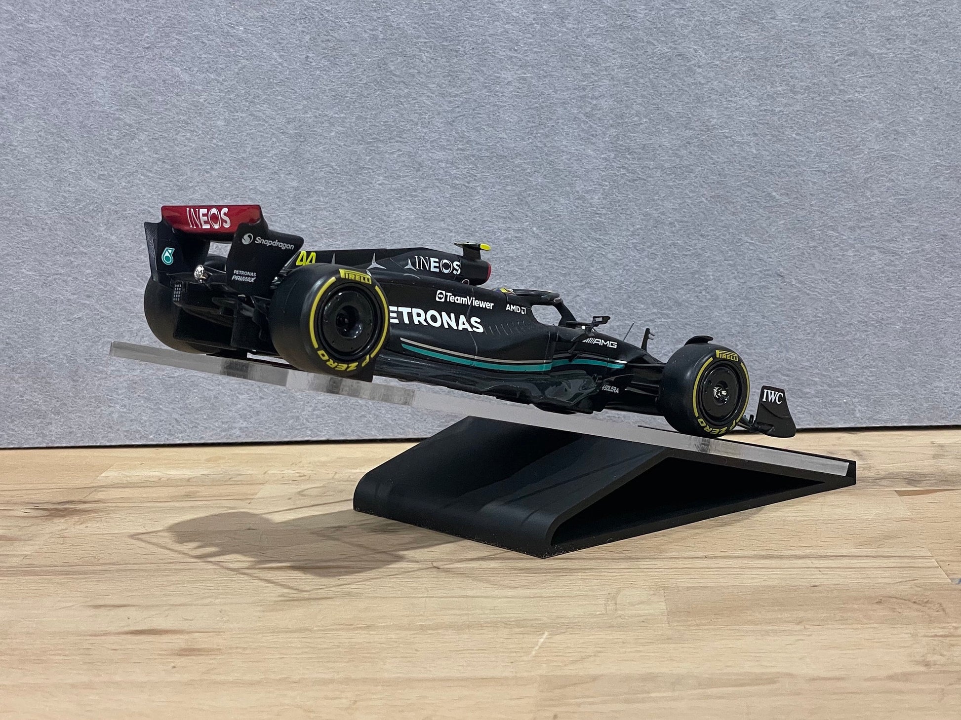 Exhibit your 1:24 Formula 1, Indy Car, V8 Supercar, Touring Car, or Hypercar scale model like a piece of modern art in a gallery - This minimalist desktop display stand is the perfect way for displaying your collectable scale model!