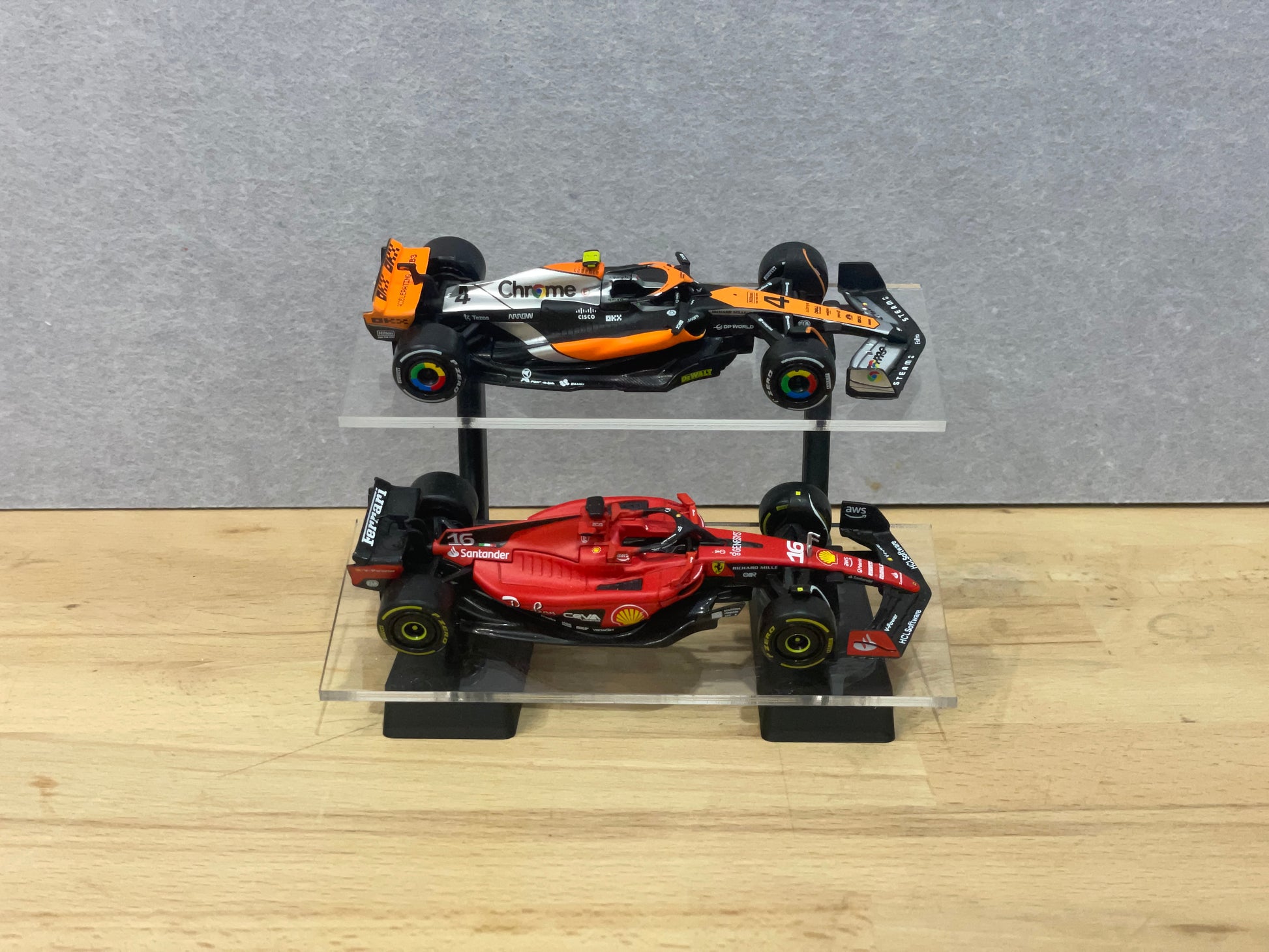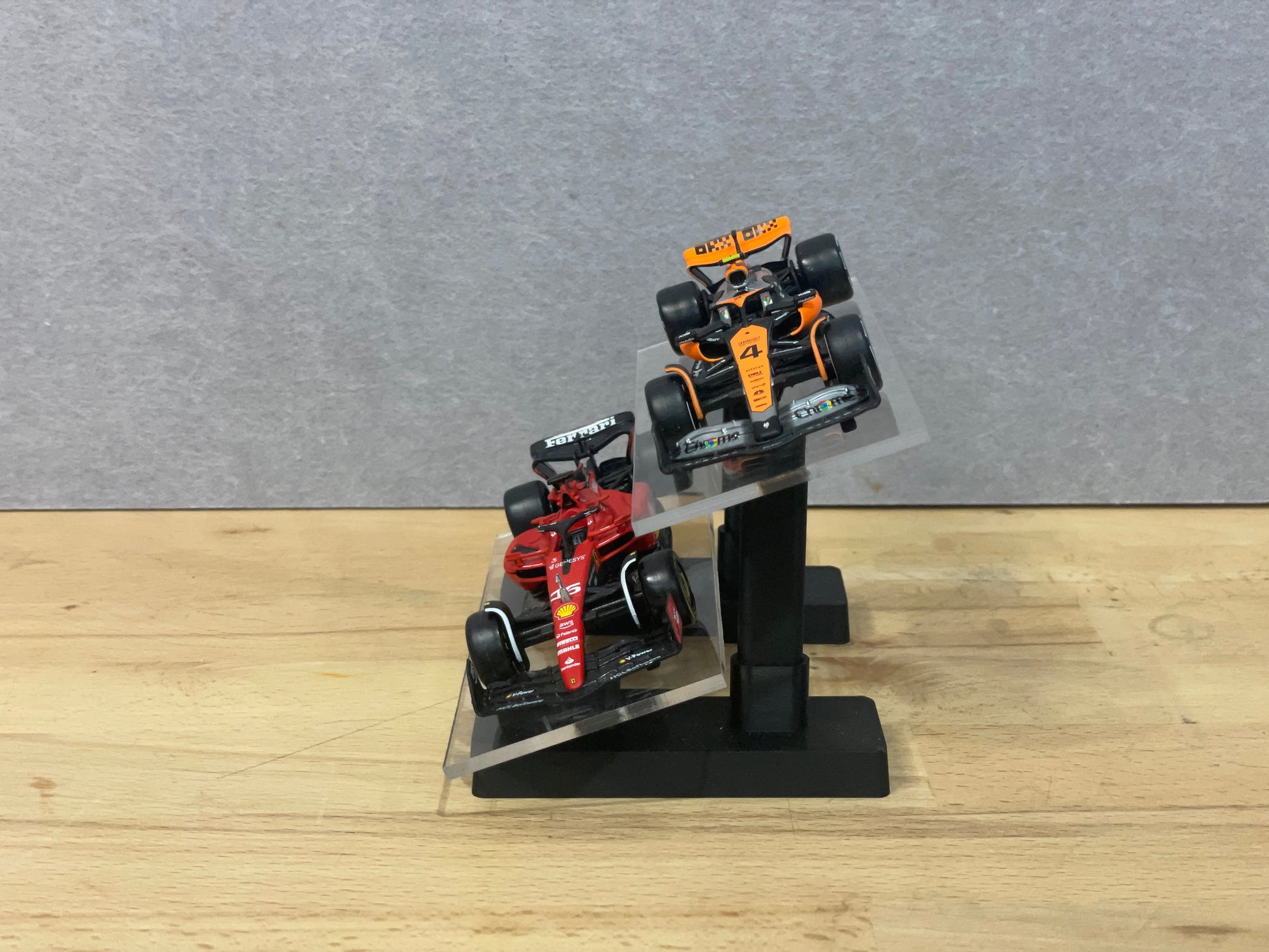 Exhibit your 1:43 Formula 1, Indy Car, V8 Supercar, Touring Car, LMP, or Hypercar scale models like pieces of modern art in a gallery - This 2 tiered angled desktop display stand is the perfect for displaying 2 of your collectable scale models!